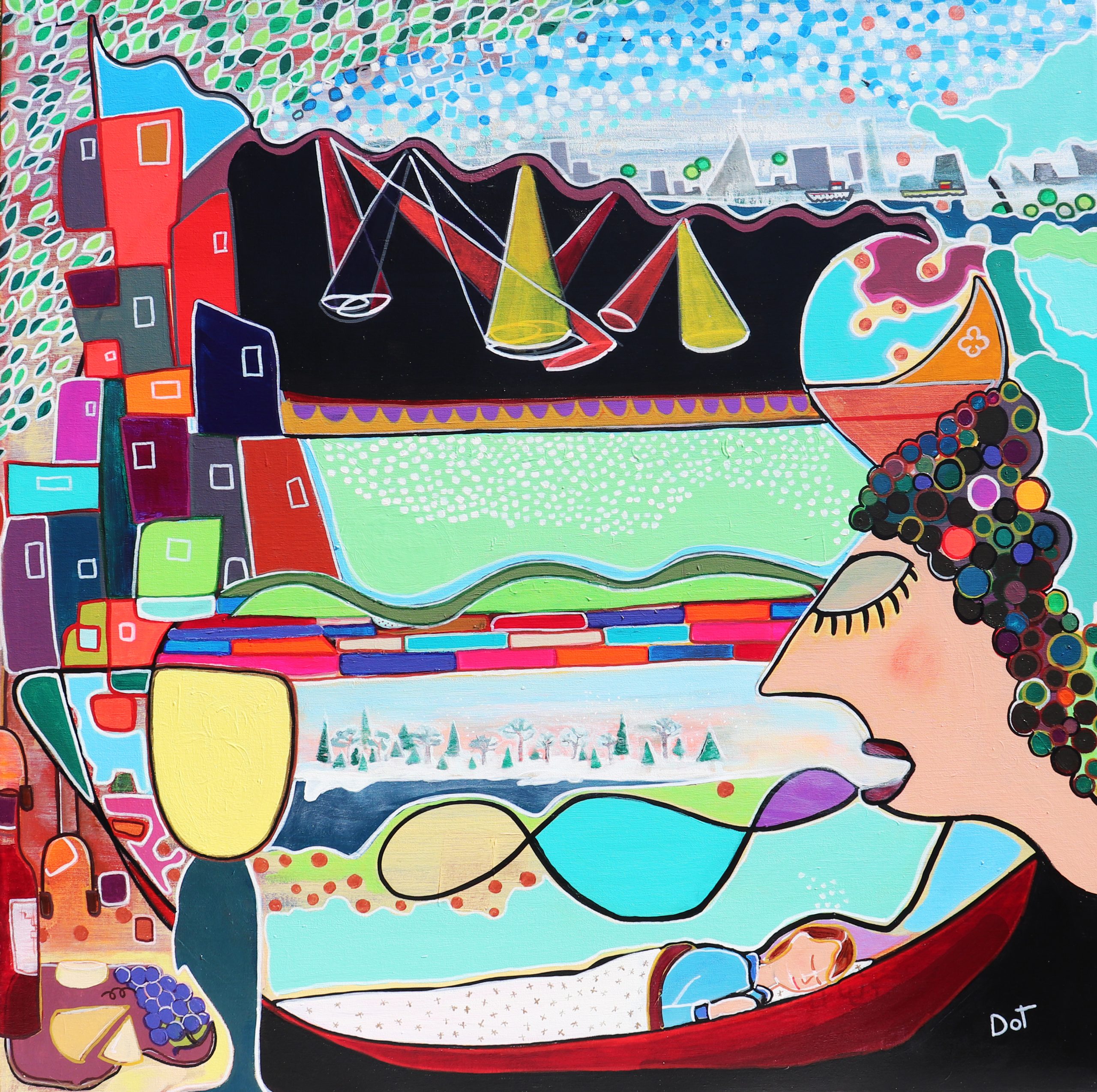In “Storyteller” (JOIES series), tales emerge through vibrant colors and flowing lines, echoing the spirit of local culture and hospitality. The composition interlaces urban and natural landscapes, where dreams wander across the seasons, guided by symbolic forms and painterly narratives.